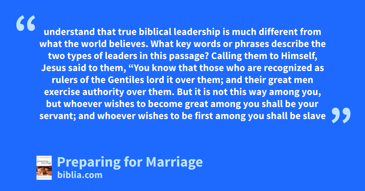 understand that true biblical leadership is much different from what the world believes. What key words or phrases describe the two types of leaders in this passage? Calling them to Himself, Jesus said to them, “You know that those who are recognized as rulers of the Gentiles lord it over them; and their great men exercise authority over them. But it is not this way among you, but whoever wishes to become great among you shall be your servant; and whoever wishes to be first among you shall be slave