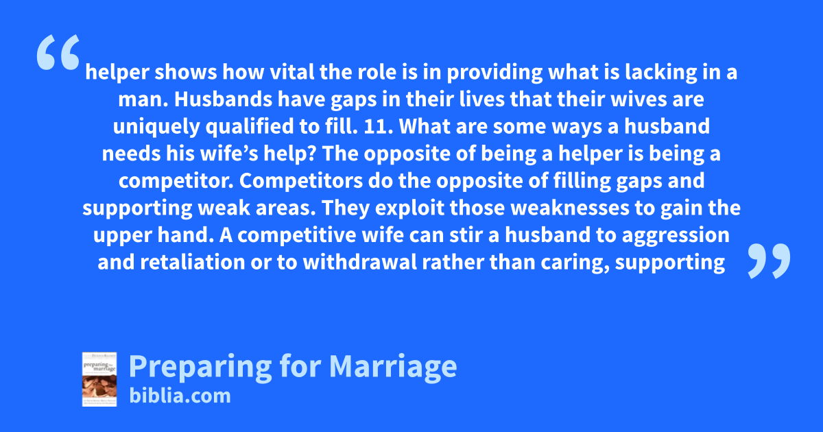 helper shows how vital the role is in providing what is lacking in a man. Husbands have gaps in their lives that their wives are uniquely qualified to fill. 11. What are some ways a husband needs his wife’s help? The opposite of being a helper is being a competitor. Competitors do the opposite of filling gaps and supporting weak areas. They exploit those weaknesses to gain the upper hand. A competitive wife can stir a husband to aggression and retaliation or to withdrawal rather than caring, supporting