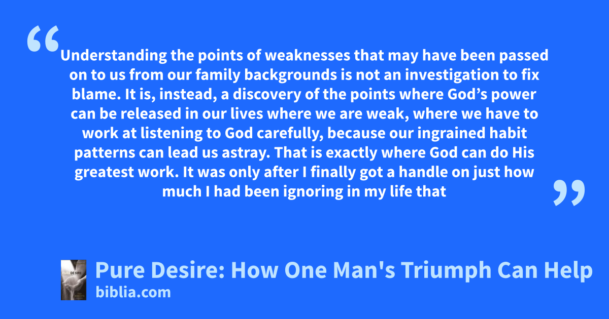 Understanding the points of weaknesses that may have been passed on to us from our family backgrounds is not an investigation to fix blame. It is, instead, a discovery of the points where God’s power can be released in our lives where we are weak, where we have to work at listening to God carefully, because our ingrained habit patterns can lead us astray. That is exactly where God can do His greatest work. It was only after I finally got a handle on just how much I had been ignoring in my life that