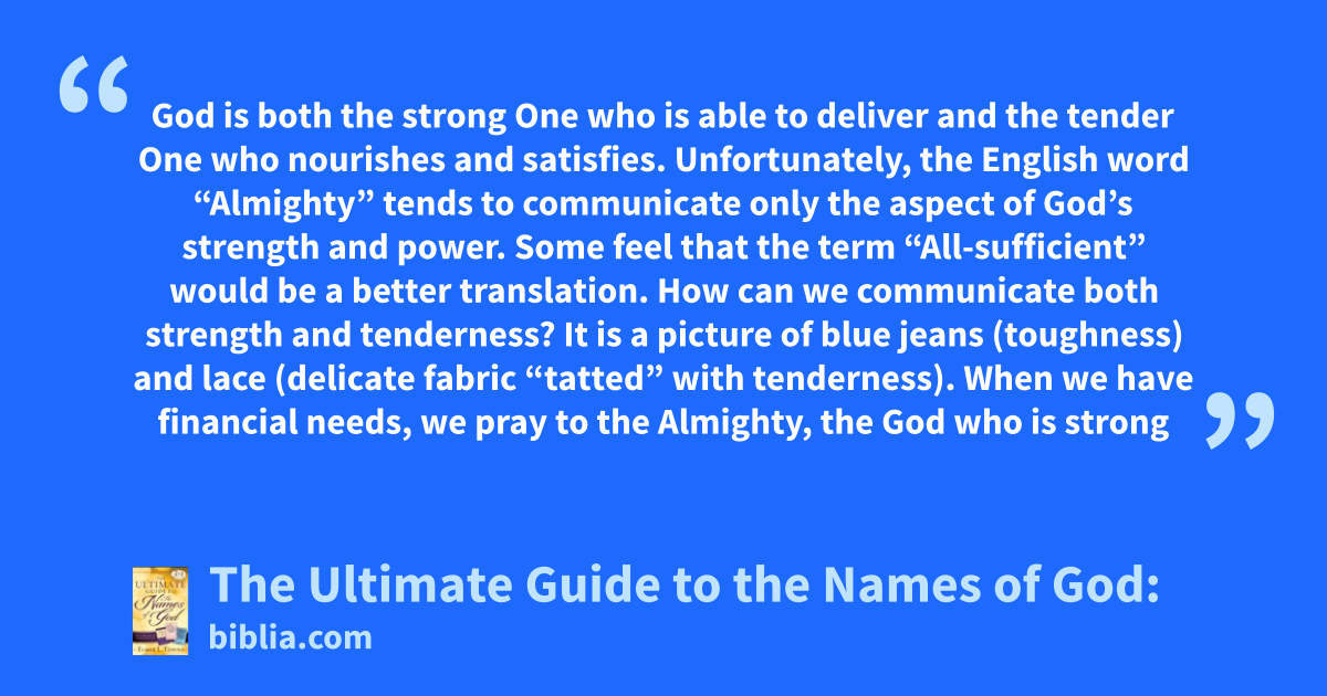 God is both the strong One who is able to deliver and the tender One who nourishes and satisfies. Unfortunately, the English word “Almighty” tends to communicate only the aspect of God’s strength and power. Some feel that the term “All-sufficient” would be a better translation. How can we communicate both strength and tenderness? It is a picture of blue jeans (toughness) and lace (delicate fabric “tatted” with tenderness). When we have financial needs, we pray to the Almighty, the God who is strong