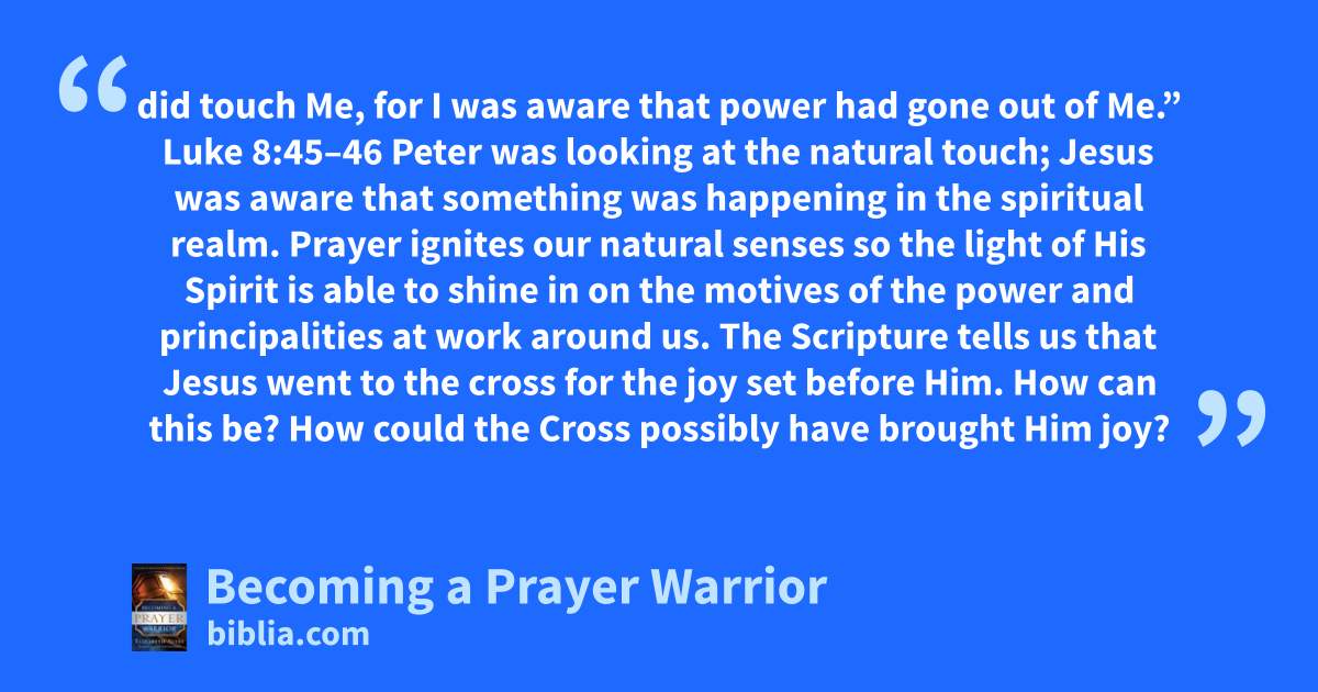 did touch Me, for I was aware that power had gone out of Me.” Luke 8:45–46 Peter was looking at the natural touch; Jesus was aware that something was happening in the spiritual realm. Prayer ignites our natural senses so the light of His Spirit is able to shine in on the motives of the power and principalities at work around us. The Scripture tells us that Jesus went to the cross for the joy set before Him. How can this be? How could the Cross possibly have brought Him joy?