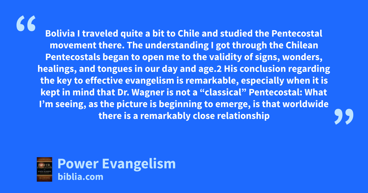 Bolivia I traveled quite a bit to Chile and studied the Pentecostal movement there. The understanding I got through the Chilean Pentecostals began to open me to the validity of signs, wonders, healings, and tongues in our day and age.2 His conclusion regarding the key to effective evangelism is remarkable, especially when it is kept in mind that Dr. Wagner is not a “classical” Pentecostal: What I’m seeing, as the picture is beginning to emerge, is that worldwide there is a remarkably close relationship