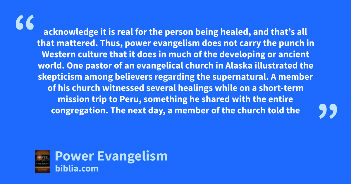 acknowledge it is real for the person being healed, and that’s all that mattered. Thus, power evangelism does not carry the punch in Western culture that it does in much of the developing or ancient world. One pastor of an evangelical church in Alaska illustrated the skepticism among believers regarding the supernatural. A member of his church witnessed several healings while on a short-term mission trip to Peru, something he shared with the entire congregation. The next day, a member of the church told the