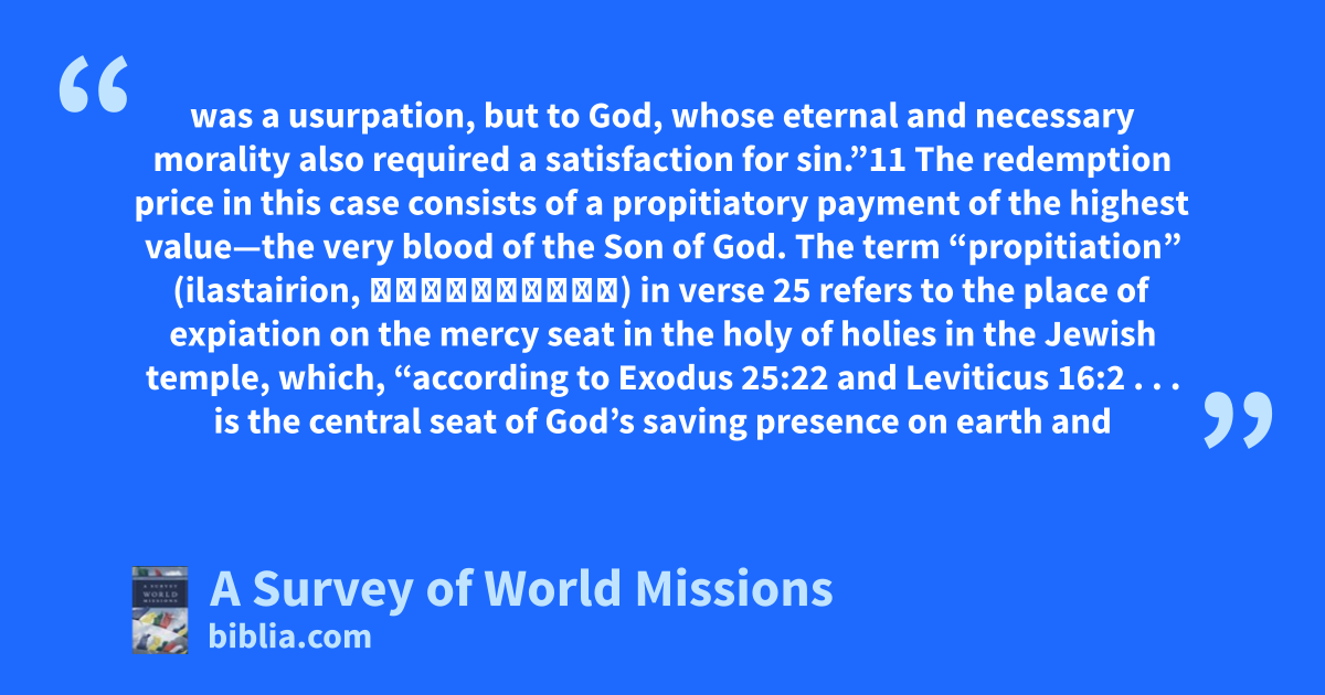 was a usurpation, but to God, whose eternal and necessary morality also required a satisfaction for sin.”11 The redemption price in this case consists of a propitiatory payment of the highest value—the very blood of the Son of God. The term “propitiation” (ilastairion, ἱλαστήριον) in verse 25 refers to the place of expiation on the mercy seat in the holy of holies in the Jewish temple, which, “according to Exodus 25:22 and Leviticus 16:2 . . . is the central seat of God’s saving presence on earth and