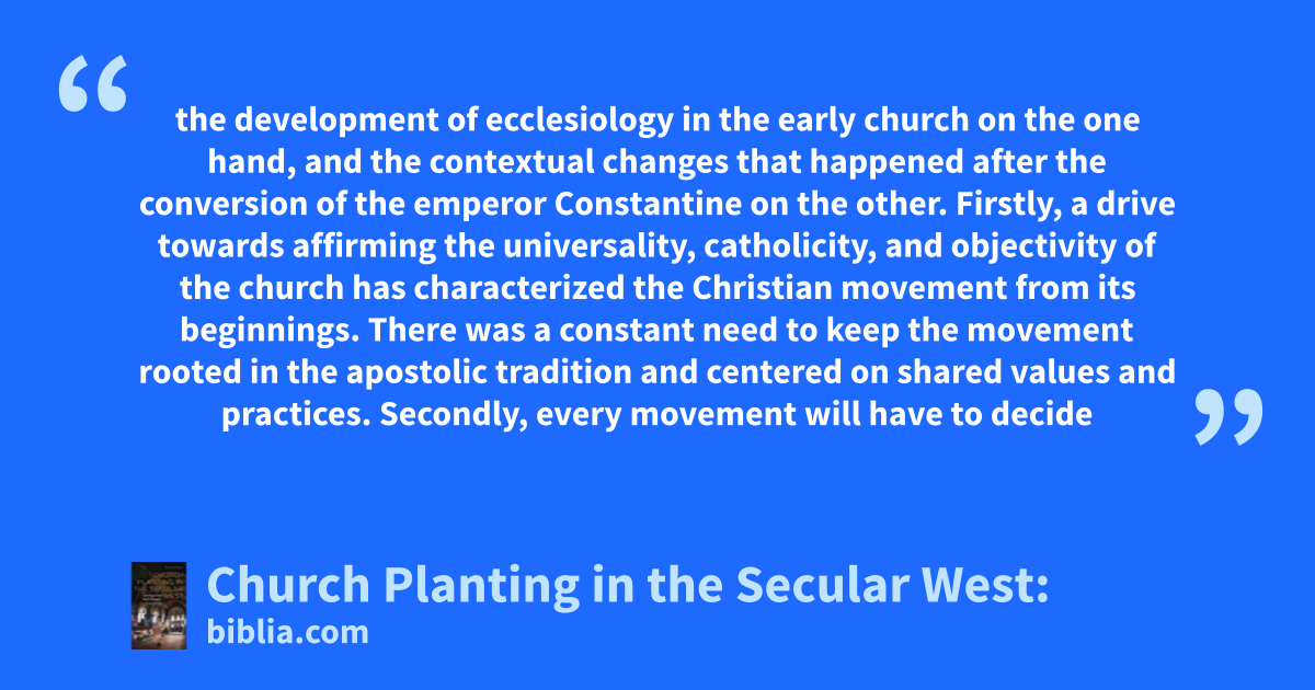 the development of ecclesiology in the early church on the one hand, and the contextual changes that happened after the conversion of the emperor Constantine on the other. Firstly, a drive towards affirming the universality, catholicity, and objectivity of the church has characterized the Christian movement from its beginnings. There was a constant need to keep the movement rooted in the apostolic tradition and centered on shared values and practices. Secondly, every movement will have to decide