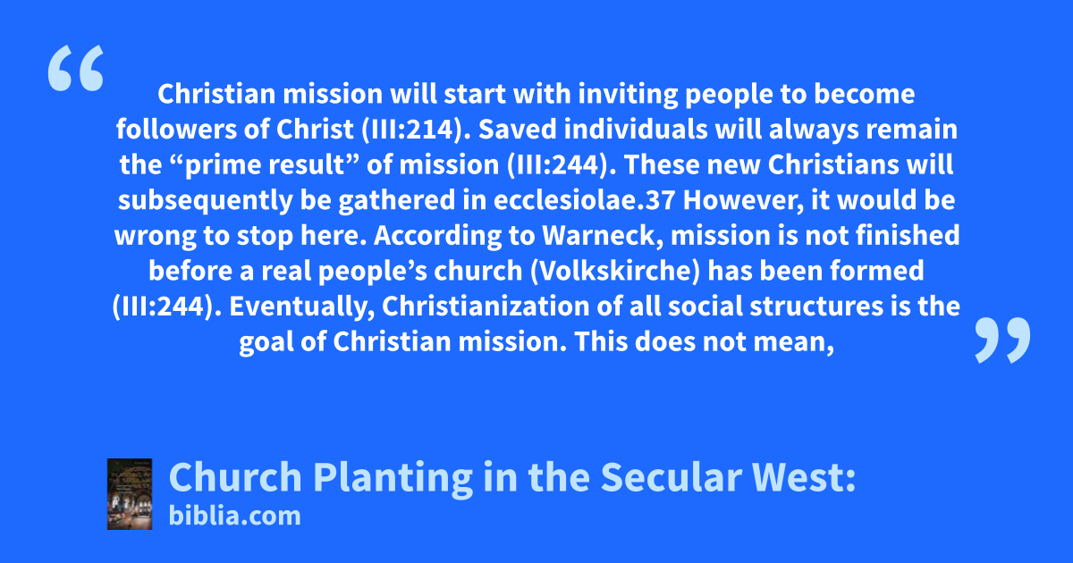 Christian mission will start with inviting people to become followers of Christ (III:214). Saved individuals will always remain the “prime result” of mission (III:244). These new Christians will subsequently be gathered in ecclesiolae.37 However, it would be wrong to stop here. According to Warneck, mission is not finished before a real people’s church (Volkskirche) has been formed (III:244). Eventually, Christianization of all social structures is the goal of Christian mission. This does not mean,