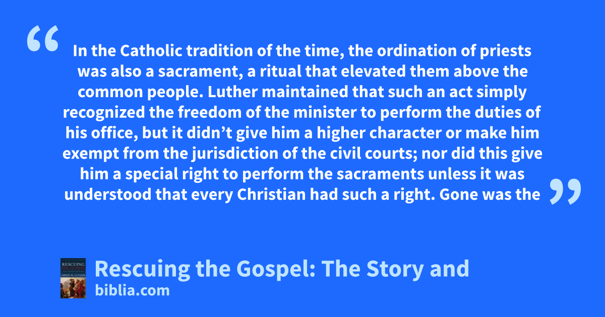 In the Catholic tradition of the time, the ordination of priests was also a sacrament, a ritual that elevated them above the common people. Luther maintained that such an act simply recognized the freedom of the minister to perform the duties of his office, but it didn’t give him a higher character or make him exempt from the jurisdiction of the civil courts; nor did this give him a special right to perform the sacraments unless it was understood that every Christian had such a right. Gone was the