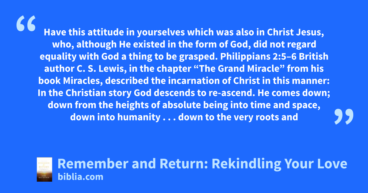 Have this attitude in yourselves which was also in Christ Jesus, who, although He existed in the form of God, did not regard equality with God a thing to be grasped. Philippians 2:5–6 British author C. S. Lewis, in the chapter “The Grand Miracle” from his book Miracles, described the incarnation of Christ in this manner: In the Christian story God descends to re-ascend. He comes down; down from the heights of absolute being into time and space, down into humanity . . . down to the very roots and