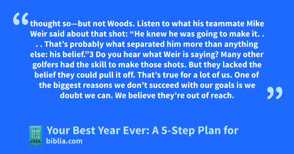 thought so—but not Woods. Listen to what his teammate Mike Weir said about that shot: “He knew he was going to make it. . . . That’s probably what separated him more than anything else: his belief.”3 Do you hear what Weir is saying? Many other golfers had the skill to make those shots. But they lacked the belief they could pull it off. That’s true for a lot of us. One of the biggest reasons we don’t succeed with our goals is we doubt we can. We believe they’re out of reach.
