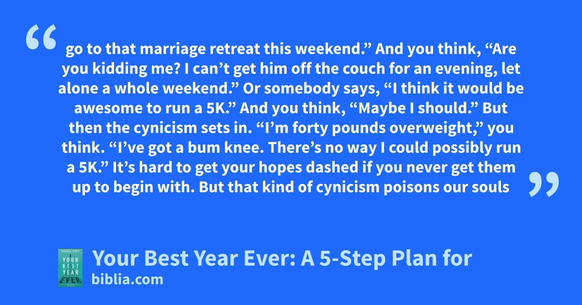 go to that marriage retreat this weekend.” And you think, “Are you kidding me? I can’t get him off the couch for an evening, let alone a whole weekend.” Or somebody says, “I think it would be awesome to run a 5K.” And you think, “Maybe I should.” But then the cynicism sets in. “I’m forty pounds overweight,” you think. “I’ve got a bum knee. There’s no way I could possibly run a 5K.” It’s hard to get your hopes dashed if you never get them up to begin with. But that kind of cynicism poisons our souls
