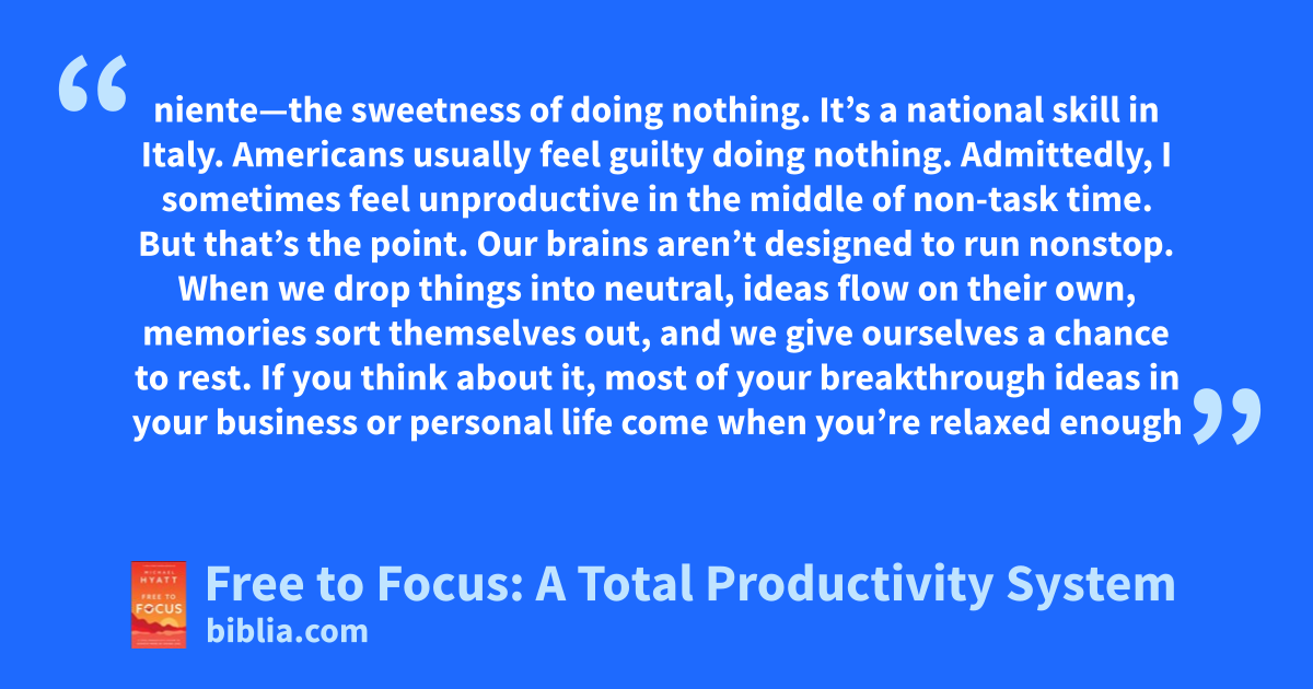 niente—the sweetness of doing nothing. It’s a national skill in Italy. Americans usually feel guilty doing nothing. Admittedly, I sometimes feel unproductive in the middle of non-task time. But that’s the point. Our brains aren’t designed to run nonstop. When we drop things into neutral, ideas flow on their own, memories sort themselves out, and we give ourselves a chance to rest. If you think about it, most of your breakthrough ideas in your business or personal life come when you’re relaxed enough