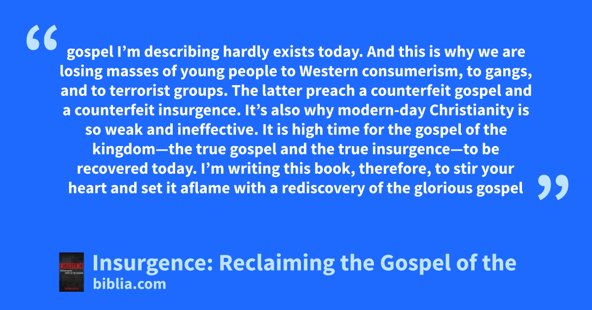 gospel I’m describing hardly exists today. And this is why we are losing masses of young people to Western consumerism, to gangs, and to terrorist groups. The latter preach a counterfeit gospel and a counterfeit insurgence. It’s also why modern-day Christianity is so weak and ineffective. It is high time for the gospel of the kingdom—the true gospel and the true insurgence—to be recovered today. I’m writing this book, therefore, to stir your heart and set it aflame with a rediscovery of the glorious gospel