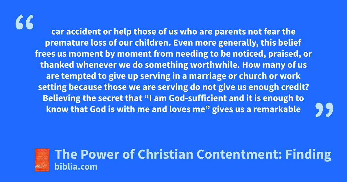 car accident or help those of us who are parents not fear the premature loss of our children. Even more generally, this belief frees us moment by moment from needing to be noticed, praised, or thanked whenever we do something worthwhile. How many of us are tempted to give up serving in a marriage or church or work setting because those we are serving do not give us enough credit? Believing the secret that “I am God-sufficient and it is enough to know that God is with me and loves me” gives us a remarkable
