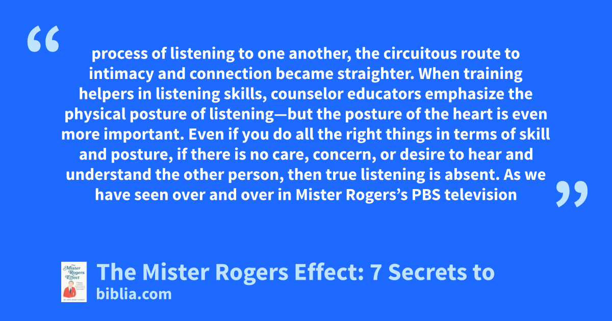 process of listening to one another, the circuitous route to intimacy and connection became straighter. When training helpers in listening skills, counselor educators emphasize the physical posture of listening—but the posture of the heart is even more important. Even if you do all the right things in terms of skill and posture, if there is no care, concern, or desire to hear and understand the other person, then true listening is absent. As we have seen over and over in Mister Rogers’s PBS television