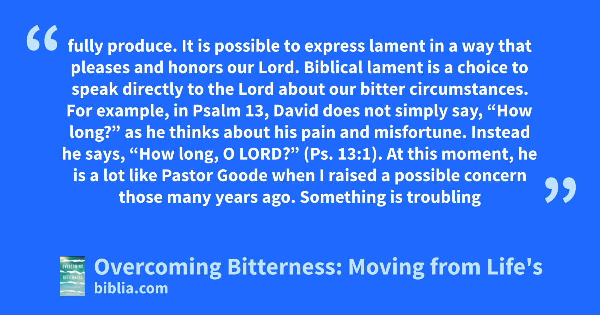 fully produce. It is possible to express lament in a way that pleases and honors our Lord. Biblical lament is a choice to speak directly to the Lord about our bitter circumstances. For example, in Psalm 13, David does not simply say, “How long?” as he thinks about his pain and misfortune. Instead he says, “How long, O LORD?” (Ps. 13:1). At this moment, he is a lot like Pastor Goode when I raised a possible concern those many years ago. Something is troubling