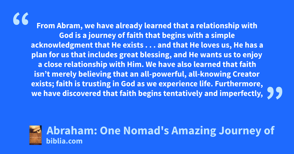 From Abram, we have already learned that a relationship with God is a journey of faith that begins with a simple acknowledgment that He exists . . . and that He loves us, He has a plan for us that includes great blessing, and He wants us to enjoy a close relationship with Him. We have also learned that faith isn’t merely believing that an all-powerful, all-knowing Creator exists; faith is trusting in God as we experience life. Furthermore, we have discovered that faith begins tentatively and imperfectly,