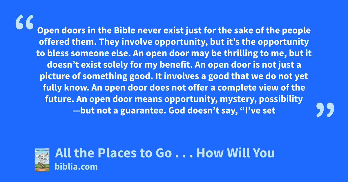 Open doors in the Bible never exist just for the sake of the people offered them. They involve opportunity, but it’s the opportunity to bless someone else. An open door may be thrilling to me, but it doesn’t exist solely for my benefit. An open door is not just a picture of something good. It involves a good that we do not yet fully know. An open door does not offer a complete view of the future. An open door means opportunity, mystery, possibility —but not a guarantee. God doesn’t say, “I’ve set