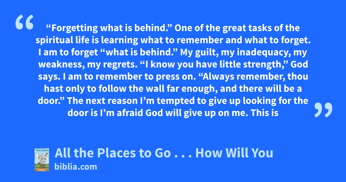 “Forgetting what is behind.” One of the great tasks of the spiritual life is learning what to remember and what to forget. I am to forget “what is behind.” My guilt, my inadequacy, my weakness, my regrets. “I know you have little strength,” God says. I am to remember to press on. “Always remember, thou hast only to follow the wall far enough, and there will be a door.” The next reason I’m tempted to give up looking for the door is I’m afraid God will give up on me. This is