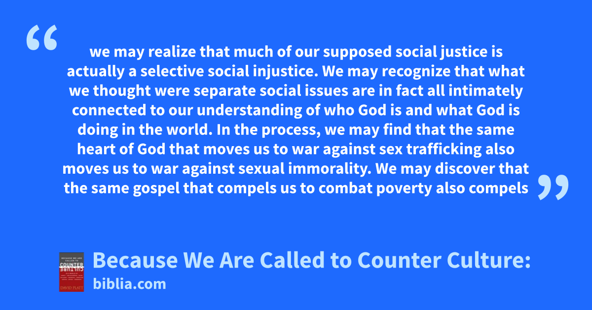 we may realize that much of our supposed social justice is actually a selective social injustice. We may recognize that what we thought were separate social issues are in fact all intimately connected to our understanding of who God is and what God is doing in the world. In the process, we may find that the same heart of God that moves us to war against sex trafficking also moves us to war against sexual immorality. We may discover that the same gospel that compels us to combat poverty also compels
