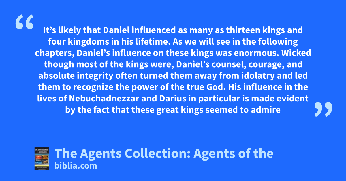 It’s likely that Daniel influenced as many as thirteen kings and four kingdoms in his lifetime. As we will see in the following chapters, Daniel’s influence on these kings was enormous. Wicked though most of the kings were, Daniel’s counsel, courage, and absolute integrity often turned them away from idolatry and led them to recognize the power of the true God. His influence in the lives of Nebuchadnezzar and Darius in particular is made evident by the fact that these great kings seemed to admire
