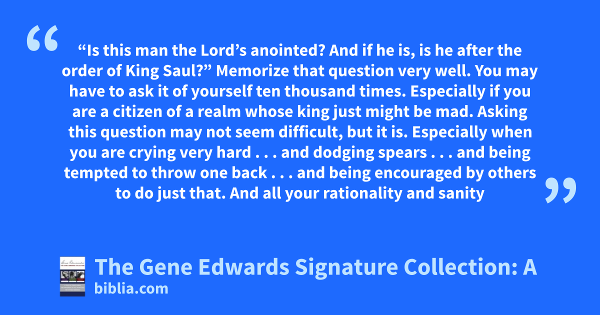 “Is this man the Lord’s anointed? And if he is, is he after the order of King Saul?” Memorize that question very well. You may have to ask it of yourself ten thousand times. Especially if you are a citizen of a realm whose king just might be mad. Asking this question may not seem difficult, but it is. Especially when you are crying very hard . . . and dodging spears . . . and being tempted to throw one back . . . and being encouraged by others to do just that. And all your rationality and sanity