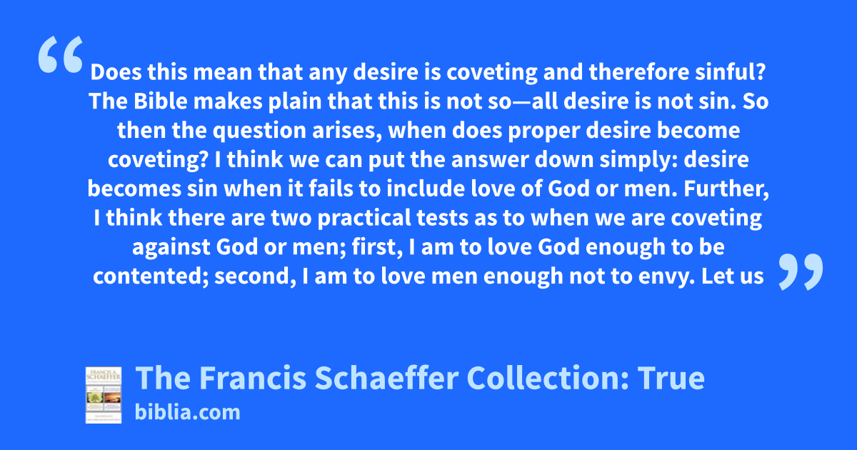 Does this mean that any desire is coveting and therefore sinful? The Bible makes plain that this is not so—all desire is not sin. So then the question arises, when does proper desire become coveting? I think we can put the answer down simply: desire becomes sin when it fails to include love of God or men. Further, I think there are two practical tests as to when we are coveting against God or men; first, I am to love God enough to be contented; second, I am to love men enough not to envy. Let us