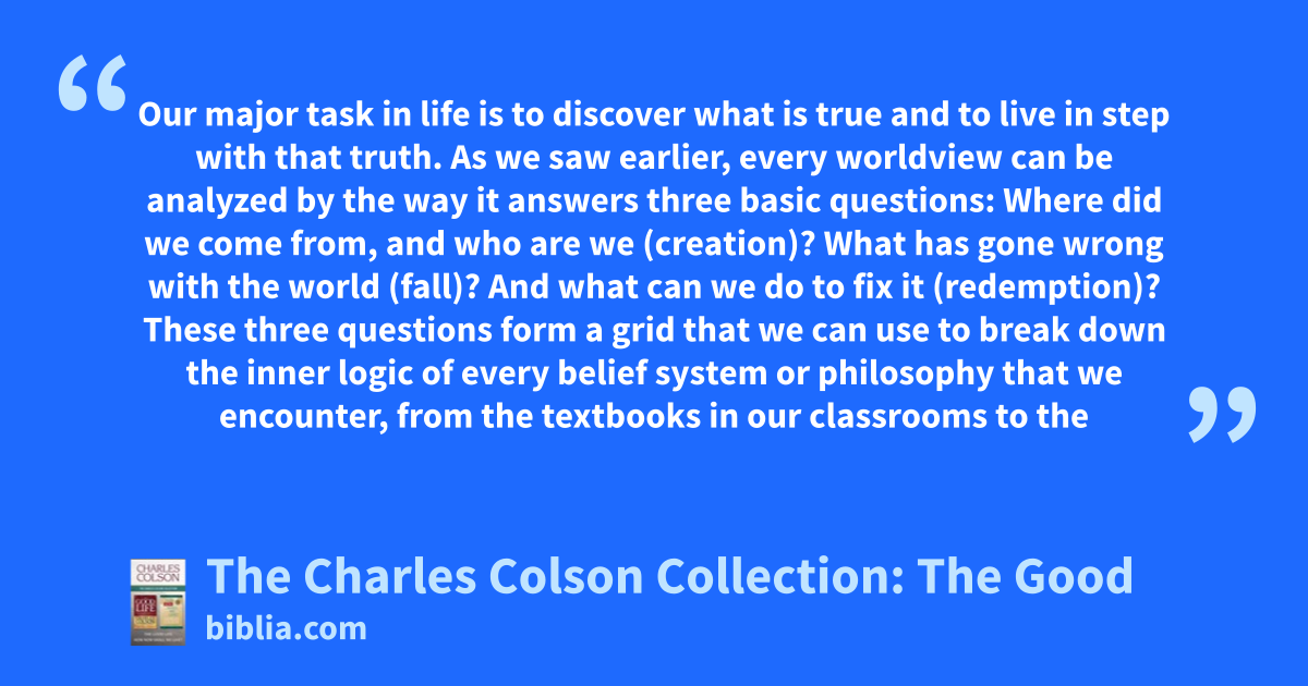 Our major task in life is to discover what is true and to live in step with that truth. As we saw earlier, every worldview can be analyzed by the way it answers three basic questions: Where did we come from, and who are we (creation)? What has gone wrong with the world (fall)? And what can we do to fix it (redemption)? These three questions form a grid that we can use to break down the inner logic of every belief system or philosophy that we encounter, from the textbooks in our classrooms to the