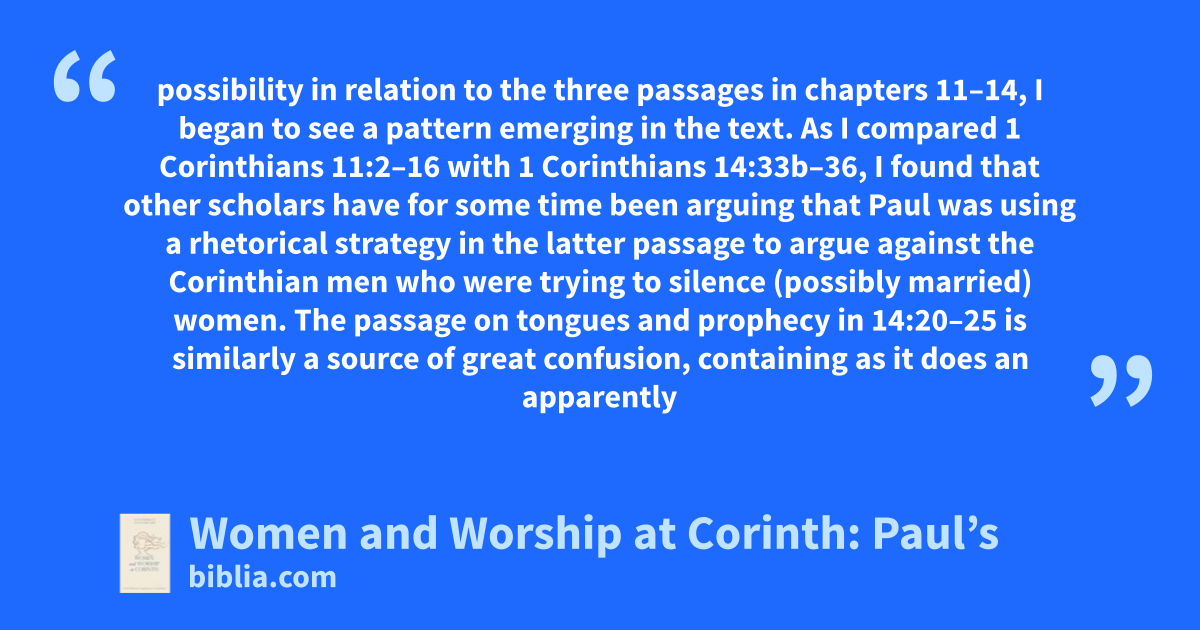 possibility in relation to the three passages in chapters 11–14, I began to see a pattern emerging in the text. As I compared 1 Corinthians 11:2–16 with 1 Corinthians 14:33b–36, I found that other scholars have for some time been arguing that Paul was using a rhetorical strategy in the latter passage to argue against the Corinthian men who were trying to silence (possibly married) women. The passage on tongues and prophecy in 14:20–25 is similarly a source of great confusion, containing as it does an apparently