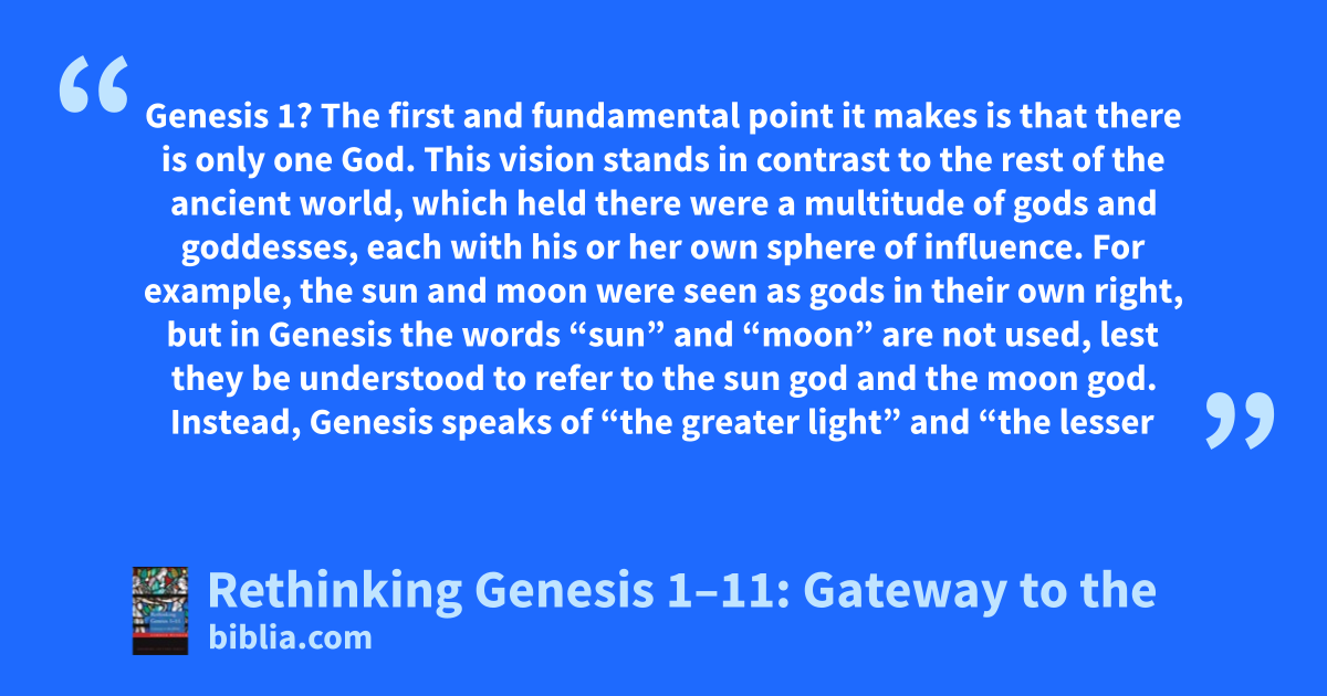 Genesis 1? The first and fundamental point it makes is that there is only one God. This vision stands in contrast to the rest of the ancient world, which held there were a multitude of gods and goddesses, each with his or her own sphere of influence. For example, the sun and moon were seen as gods in their own right, but in Genesis the words “sun” and “moon” are not used, lest they be understood to refer to the sun god and the moon god. Instead, Genesis speaks of “the greater light” and “the lesser