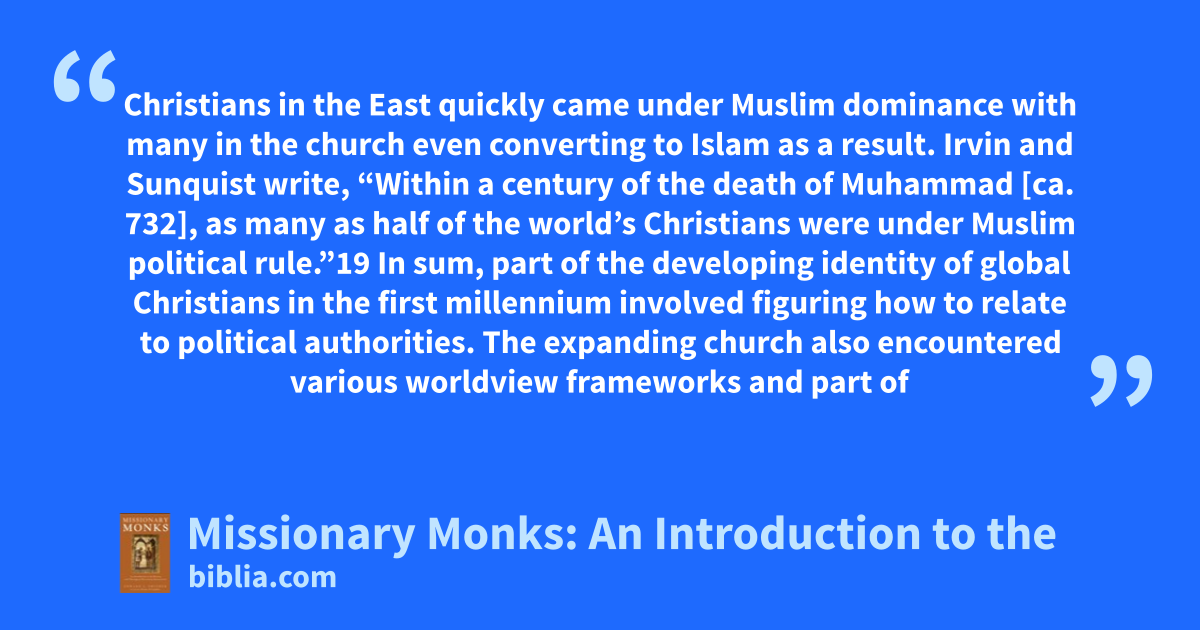 Christians in the East quickly came under Muslim dominance with many in the church even converting to Islam as a result. Irvin and Sunquist write, “Within a century of the death of Muhammad [ca. 732], as many as half of the world’s Christians were under Muslim political rule.”19 In sum, part of the developing identity of global Christians in the first millennium involved figuring how to relate to political authorities. The expanding church also encountered various worldview frameworks and part of