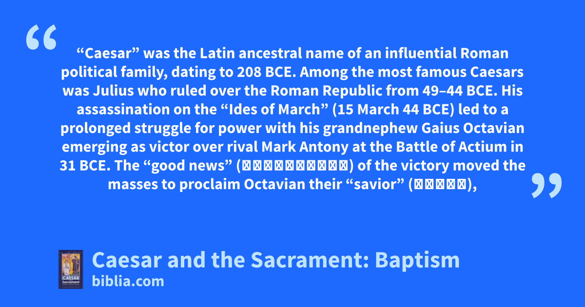 “Caesar” was the Latin ancestral name of an influential Roman political family, dating to 208 BCE. Among the most famous Caesars was Julius who ruled over the Roman Republic from 49–44 BCE. His assassination on the “Ides of March” (15 March 44 BCE) led to a prolonged struggle for power with his grandnephew Gaius Octavian emerging as victor over rival Mark Antony at the Battle of Actium in 31 BCE. The “good news” (εὐαγγέλιον) of the victory moved the masses to proclaim Octavian their “savior” (σωτὴρ),