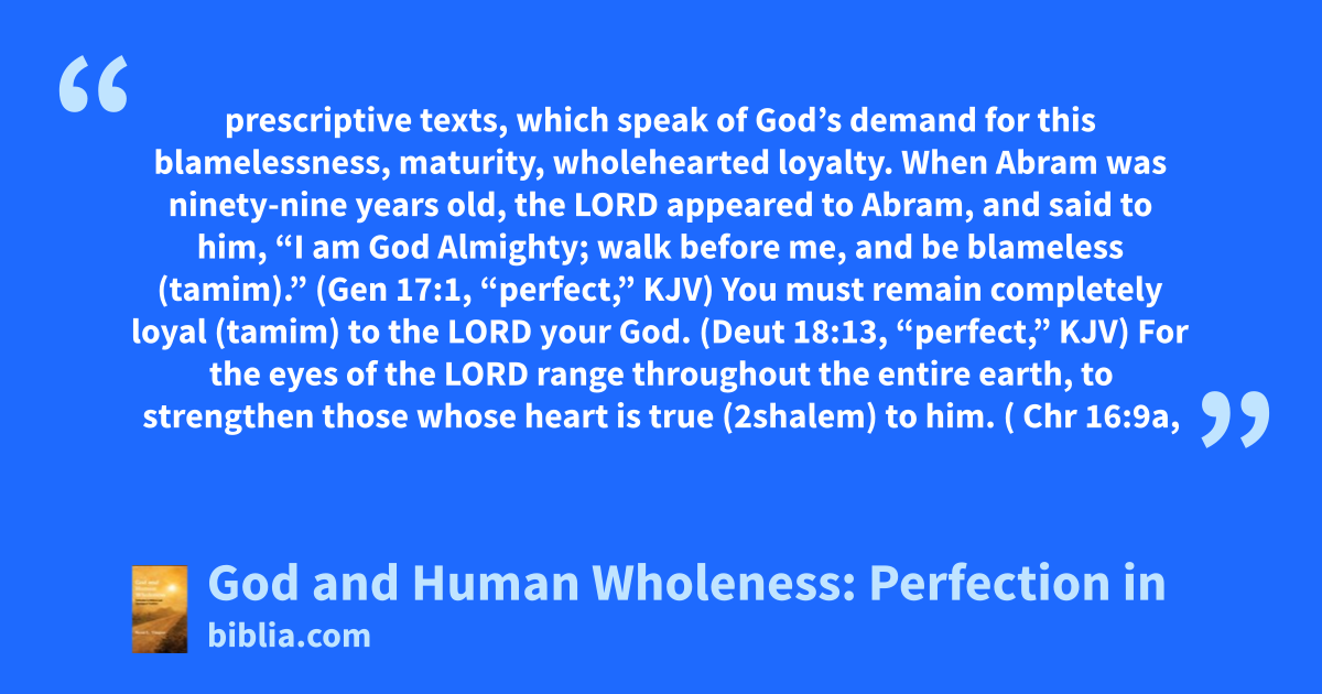 prescriptive texts, which speak of God’s demand for this blamelessness, maturity, wholehearted loyalty. When Abram was ninety-nine years old, the LORD appeared to Abram, and said to him, “I am God Almighty; walk before me, and be blameless (tamim).” (Gen 17:1, “perfect,” KJV) You must remain completely loyal (tamim) to the LORD your God. (Deut 18:13, “perfect,” KJV) For the eyes of the LORD range throughout the entire earth, to strengthen those whose heart is true (2shalem) to him. ( Chr 16:9a,