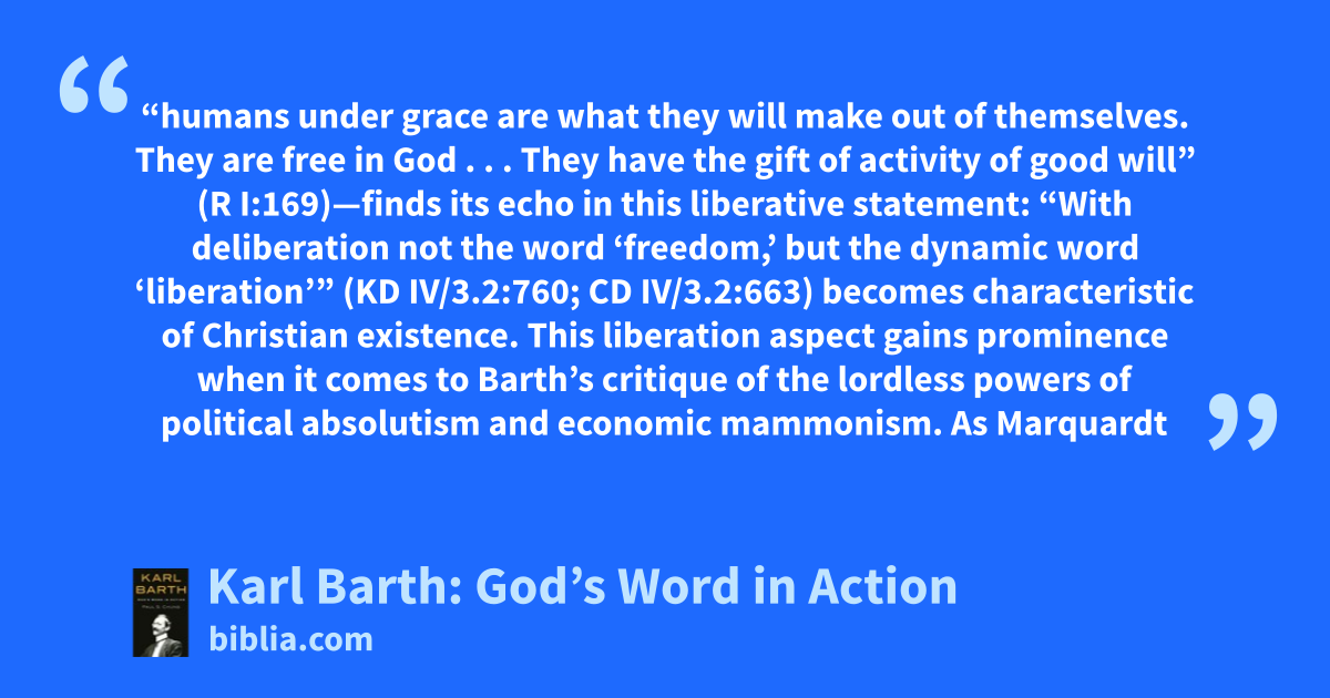 “humans under grace are what they will make out of themselves. They are free in God . . . They have the gift of activity of good will” (R I:169)—finds its echo in this liberative statement: “With deliberation not the word ‘freedom,’ but the dynamic word ‘liberation’” (KD IV/3.2:760; CD IV/3.2:663) becomes characteristic of Christian existence. This liberation aspect gains prominence when it comes to Barth’s critique of the lordless powers of political absolutism and economic mammonism. As Marquardt