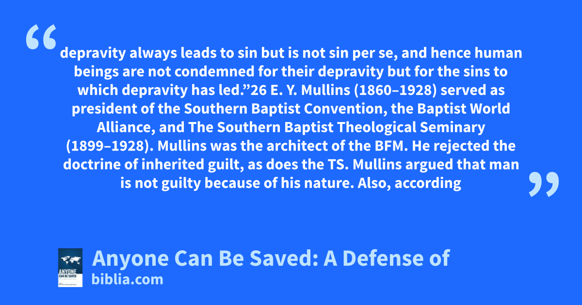 depravity always leads to sin but is not sin per se, and hence human beings are not condemned for their depravity but for the sins to which depravity has led.”26 E. Y. Mullins (1860–1928) served as president of the Southern Baptist Convention, the Baptist World Alliance, and The Southern Baptist Theological Seminary (1899–1928). Mullins was the architect of the BFM. He rejected the doctrine of inherited guilt, as does the TS. Mullins argued that man is not guilty because of his nature. Also, according