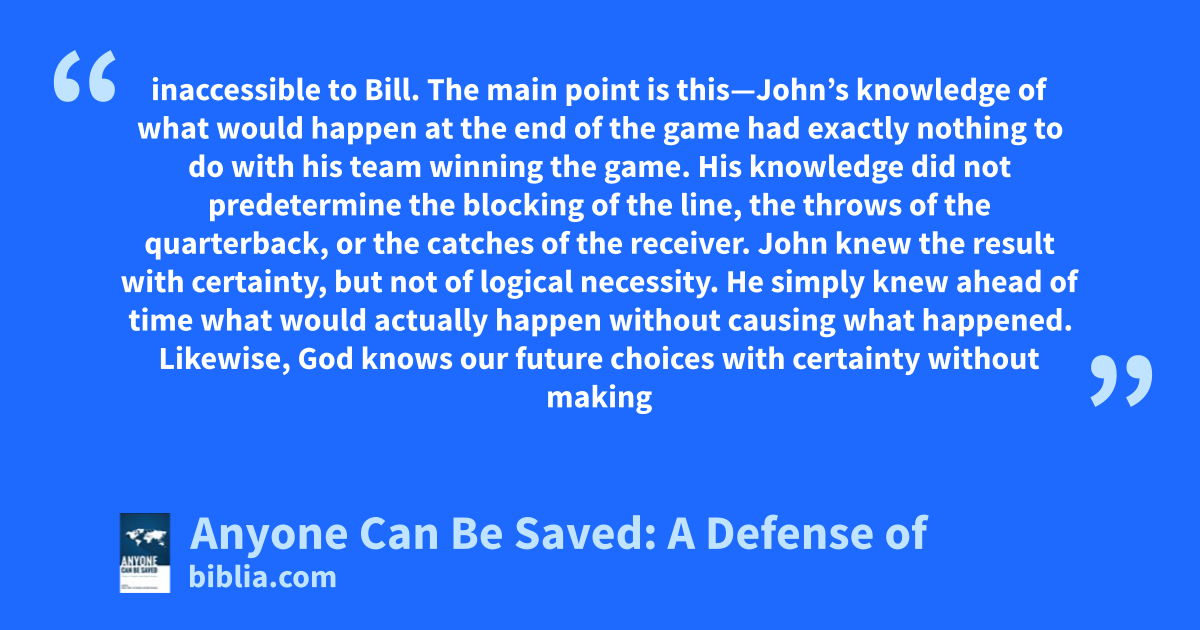 inaccessible to Bill. The main point is this—John’s knowledge of what would happen at the end of the game had exactly nothing to do with his team winning the game. His knowledge did not predetermine the blocking of the line, the throws of the quarterback, or the catches of the receiver. John knew the result with certainty, but not of logical necessity. He simply knew ahead of time what would actually happen without causing what happened. Likewise, God knows our future choices with certainty without making