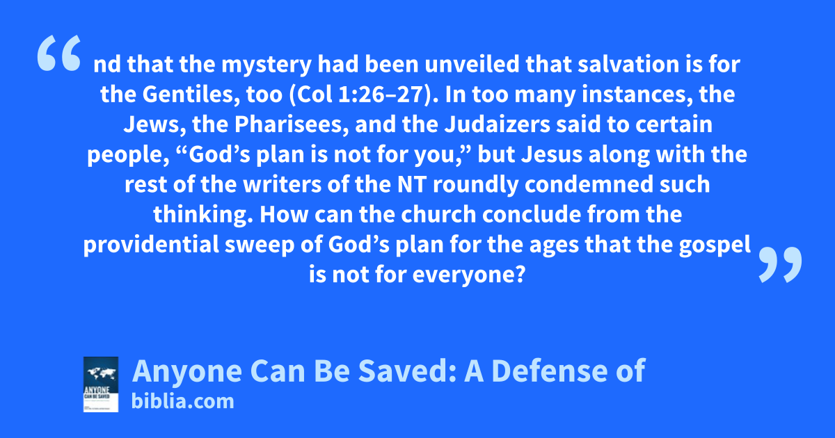 nd that the mystery had been unveiled that salvation is for the Gentiles, too (Col 1:26–27). In too many instances, the Jews, the Pharisees, and the Judaizers said to certain people, “God’s plan is not for you,” but Jesus along with the rest of the writers of the NT roundly condemned such thinking. How can the church conclude from the providential sweep of God’s plan for the ages that the gospel is not for everyone?