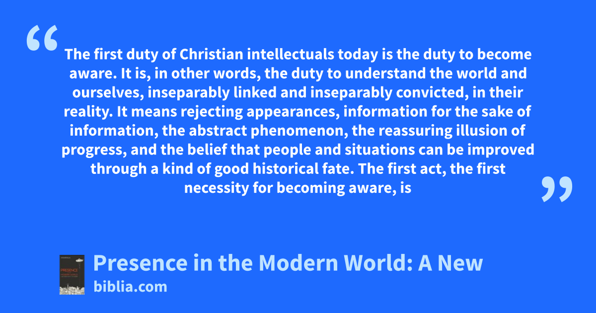 The first duty of Christian intellectuals today is the duty to become aware. It is, in other words, the duty to understand the world and ourselves, inseparably linked and inseparably convicted, in their reality. It means rejecting appearances, information for the sake of information, the abstract phenomenon, the reassuring illusion of progress, and the belief that people and situations can be improved through a kind of good historical fate. The first act, the first necessity for becoming aware, is