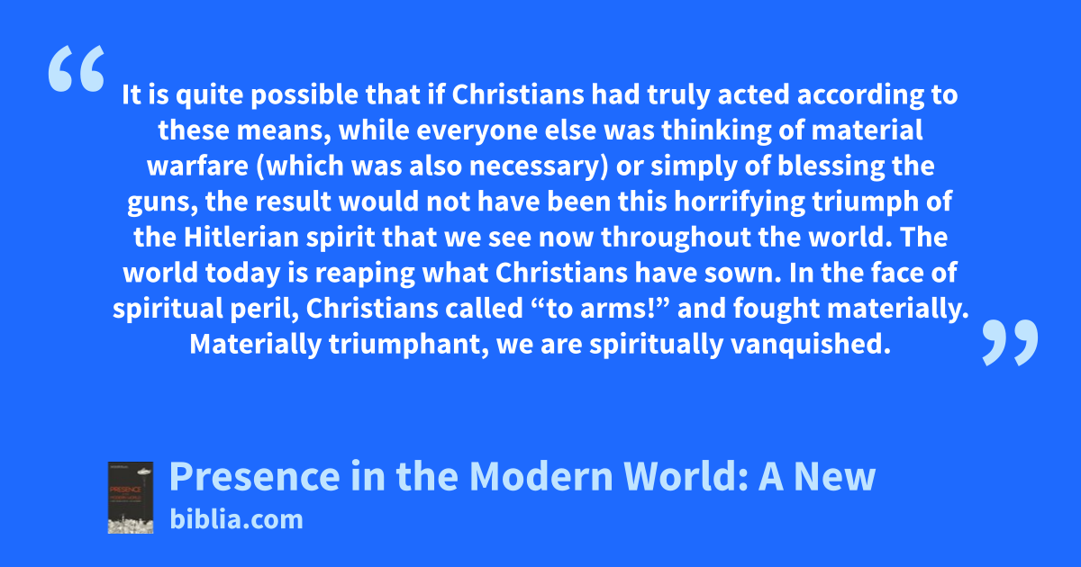 It is quite possible that if Christians had truly acted according to these means, while everyone else was thinking of material warfare (which was also necessary) or simply of blessing the guns, the result would not have been this horrifying triumph of the Hitlerian spirit that we see now throughout the world. The world today is reaping what Christians have sown. In the face of spiritual peril, Christians called “to arms!” and fought materially. Materially triumphant, we are spiritually vanquished.