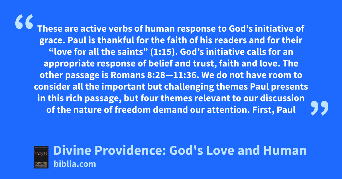 These are active verbs of human response to God’s initiative of grace. Paul is thankful for the faith of his readers and for their “love for all the saints” (1:15). God’s initiative calls for an appropriate response of belief and trust, faith and love. The other passage is Romans 8:28—11:36. We do not have room to consider all the important but challenging themes Paul presents in this rich passage, but four themes relevant to our discussion of the nature of freedom demand our attention. First, Paul