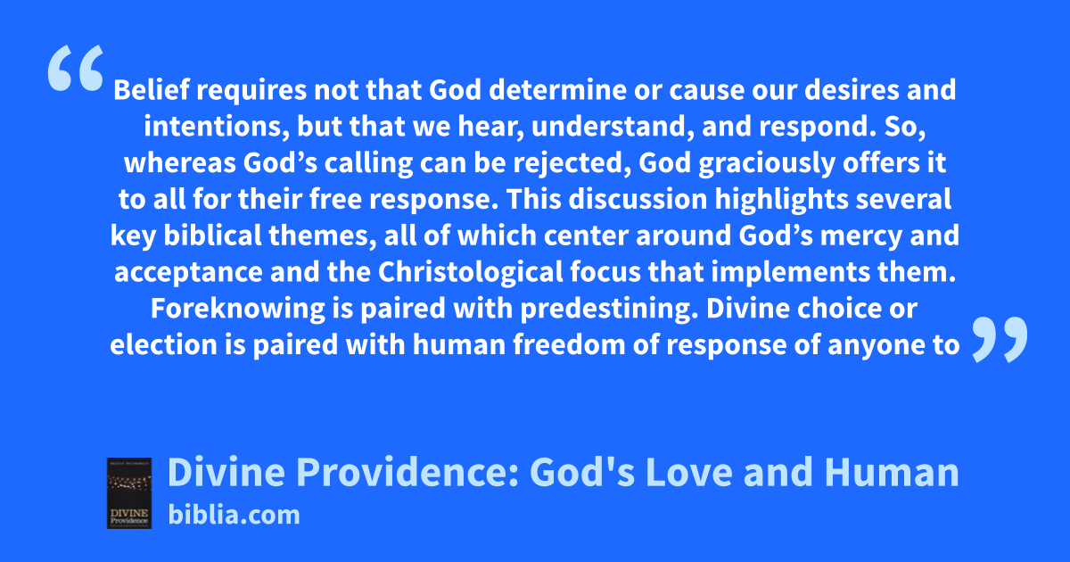 Belief requires not that God determine or cause our desires and intentions, but that we hear, understand, and respond. So, whereas God’s calling can be rejected, God graciously offers it to all for their free response. This discussion highlights several key biblical themes, all of which center around God’s mercy and acceptance and the Christological focus that implements them. Foreknowing is paired with predestining. Divine choice or election is paired with human freedom of response of anyone to