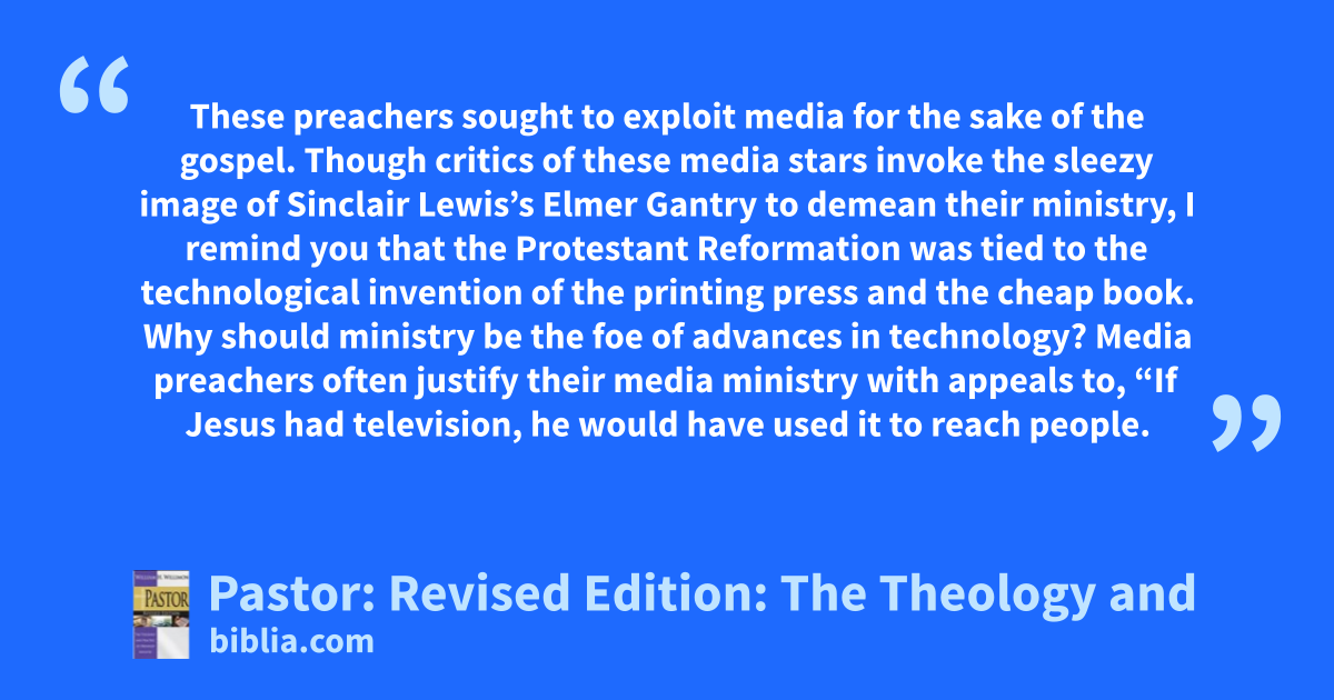 These preachers sought to exploit media for the sake of the gospel. Though critics of these media stars invoke the sleezy image of Sinclair Lewis’s Elmer Gantry to demean their ministry, I remind you that the Protestant Reformation was tied to the technological invention of the printing press and the cheap book. Why should ministry be the foe of advances in technology? Media preachers often justify their media ministry with appeals to, “If Jesus had television, he would have used it to reach people.