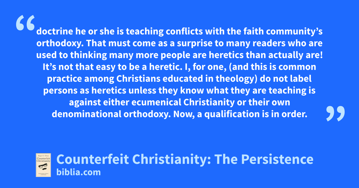doctrine he or she is teaching conflicts with the faith community’s orthodoxy. That must come as a surprise to many readers who are used to thinking many more people are heretics than actually are! It’s not that easy to be a heretic. I, for one, (and this is common practice among Christians educated in theology) do not label persons as heretics unless they know what they are teaching is against either ecumenical Christianity or their own denominational orthodoxy. Now, a qualification is in order.