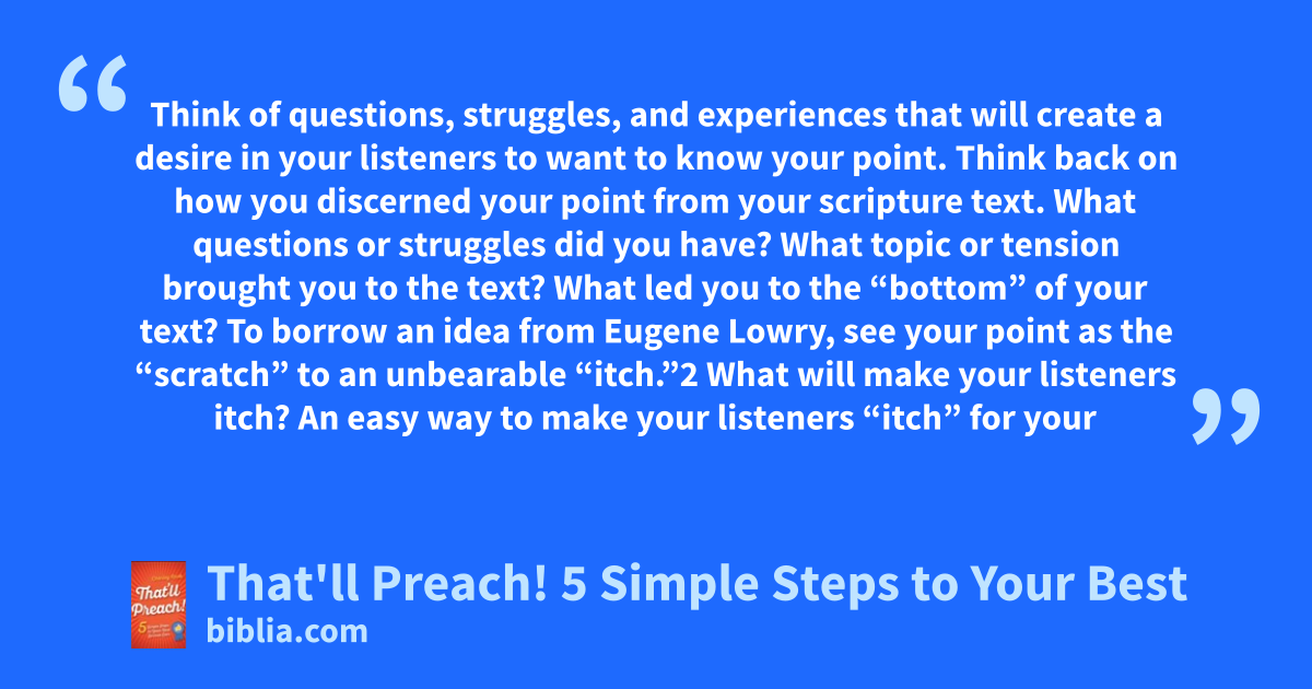 Think of questions, struggles, and experiences that will create a desire in your listeners to want to know your point. Think back on how you discerned your point from your scripture text. What questions or struggles did you have? What topic or tension brought you to the text? What led you to the “bottom” of your text? To borrow an idea from Eugene Lowry, see your point as the “scratch” to an unbearable “itch.”2 What will make your listeners itch? An easy way to make your listeners “itch” for your