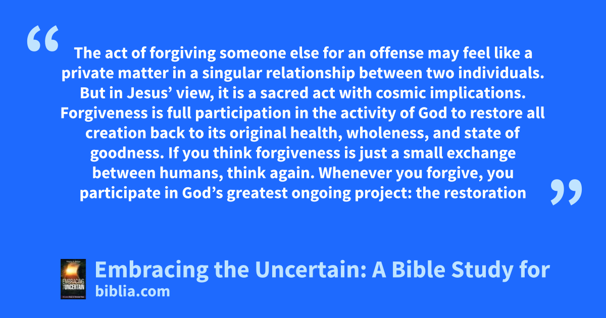 The act of forgiving someone else for an offense may feel like a private matter in a singular relationship between two individuals. But in Jesus’ view, it is a sacred act with cosmic implications. Forgiveness is full participation in the activity of God to restore all creation back to its original health, wholeness, and state of goodness. If you think forgiveness is just a small exchange between humans, think again. Whenever you forgive, you participate in God’s greatest ongoing project: the restoration