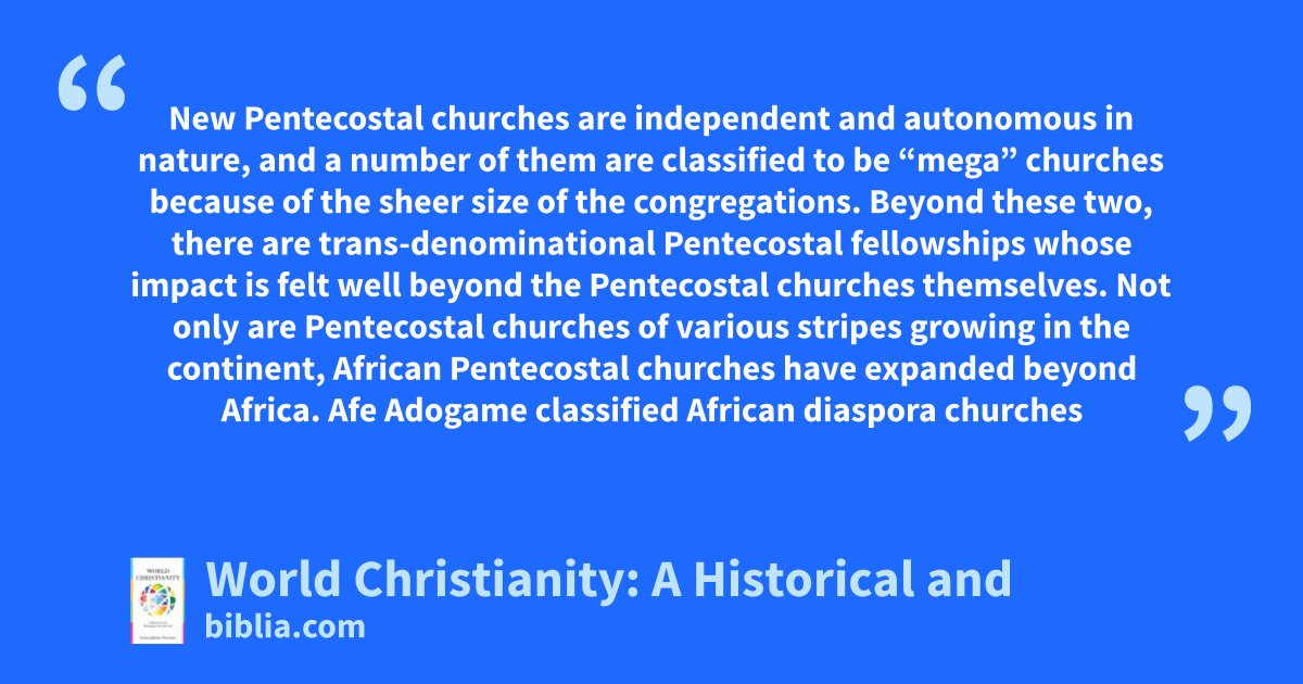 New Pentecostal churches are independent and autonomous in nature, and a number of them are classified to be “mega” churches because of the sheer size of the congregations. Beyond these two, there are trans-denominational Pentecostal fellowships whose impact is felt well beyond the Pentecostal churches themselves. Not only are Pentecostal churches of various stripes growing in the continent, African Pentecostal churches have expanded beyond Africa. Afe Adogame classified African diaspora churches