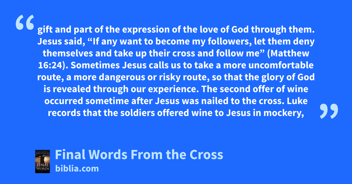 gift and part of the expression of the love of God through them. Jesus said, “If any want to become my followers, let them deny themselves and take up their cross and follow me” (Matthew 16:24). Sometimes Jesus calls us to take a more uncomfortable route, a more dangerous or risky route, so that the glory of God is revealed through our experience. The second offer of wine occurred sometime after Jesus was nailed to the cross. Luke records that the soldiers offered wine to Jesus in mockery,