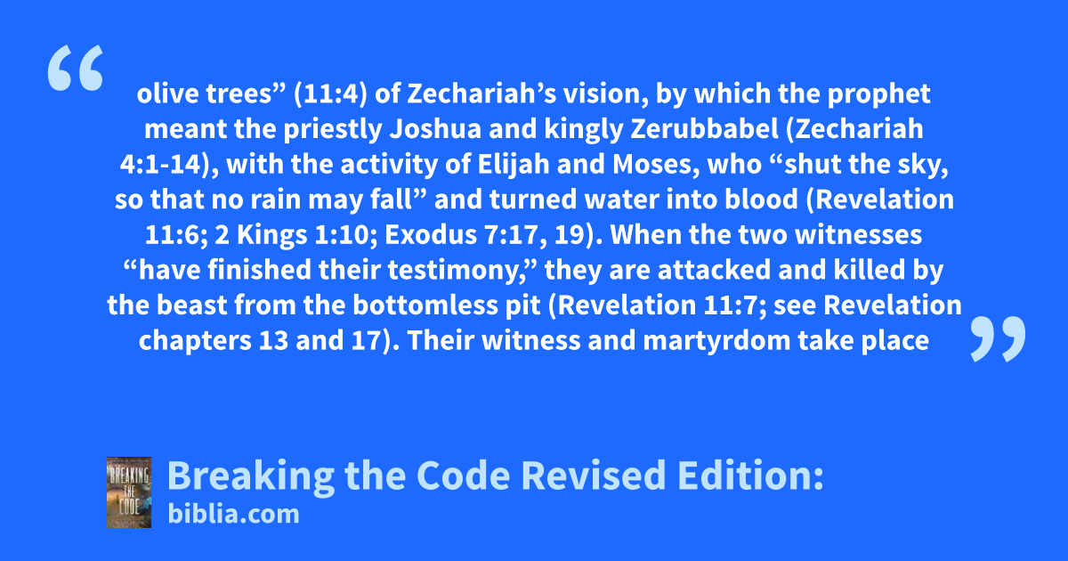 olive trees” (11:4) of Zechariah’s vision, by which the prophet meant the priestly Joshua and kingly Zerubbabel (Zechariah 4:1-14), with the activity of Elijah and Moses, who “shut the sky, so that no rain may fall” and turned water into blood (Revelation 11:6; 2 Kings 1:10; Exodus 7:17, 19). When the two witnesses “have finished their testimony,” they are attacked and killed by the beast from the bottomless pit (Revelation 11:7; see Revelation chapters 13 and 17). Their witness and martyrdom take place