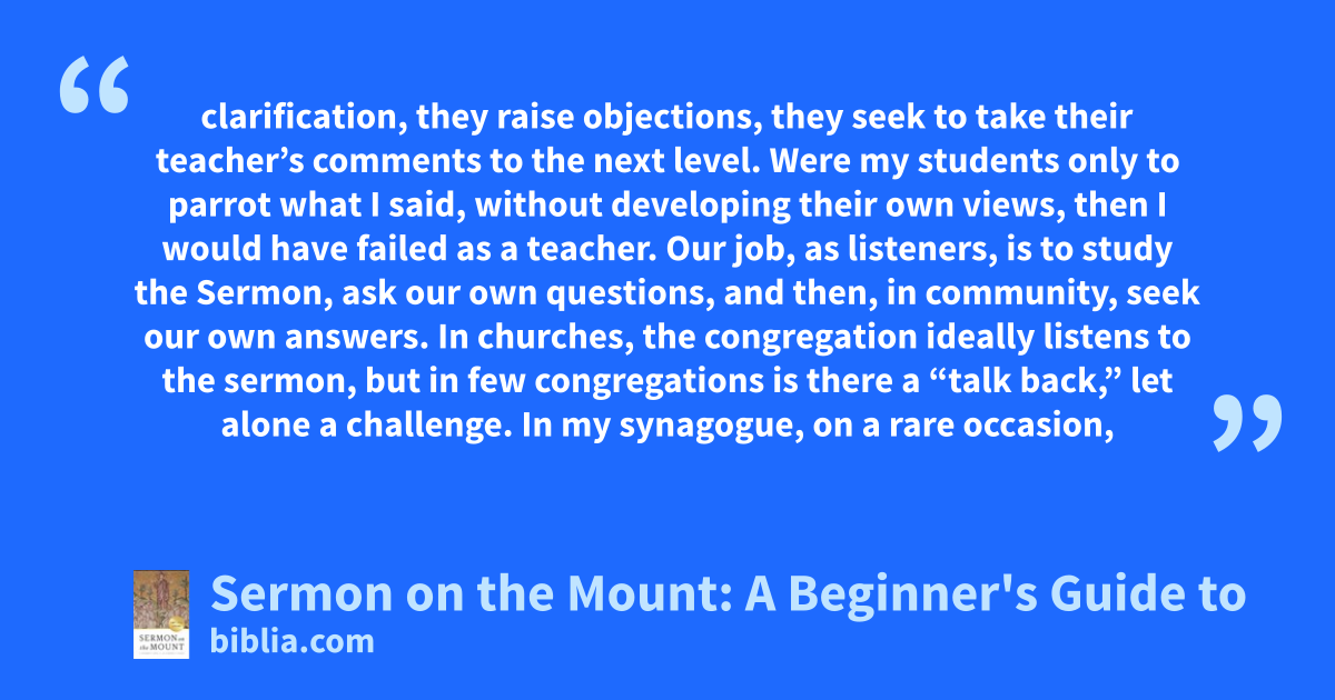 clarification, they raise objections, they seek to take their teacher’s comments to the next level. Were my students only to parrot what I said, without developing their own views, then I would have failed as a teacher. Our job, as listeners, is to study the Sermon, ask our own questions, and then, in community, seek our own answers. In churches, the congregation ideally listens to the sermon, but in few congregations is there a “talk back,” let alone a challenge. In my synagogue, on a rare occasion,