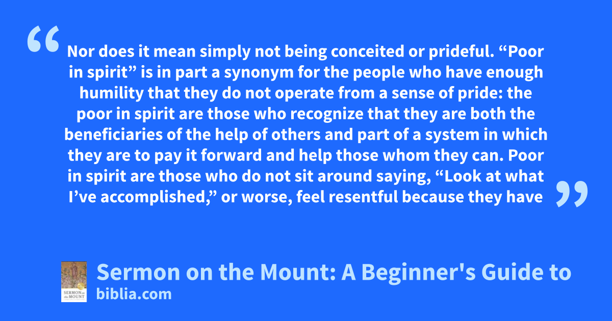 Nor does it mean simply not being conceited or prideful. “Poor in spirit” is in part a synonym for the people who have enough humility that they do not operate from a sense of pride: the poor in spirit are those who recognize that they are both the beneficiaries of the help of others and part of a system in which they are to pay it forward and help those whom they can. Poor in spirit are those who do not sit around saying, “Look at what I’ve accomplished,” or worse, feel resentful because they have
