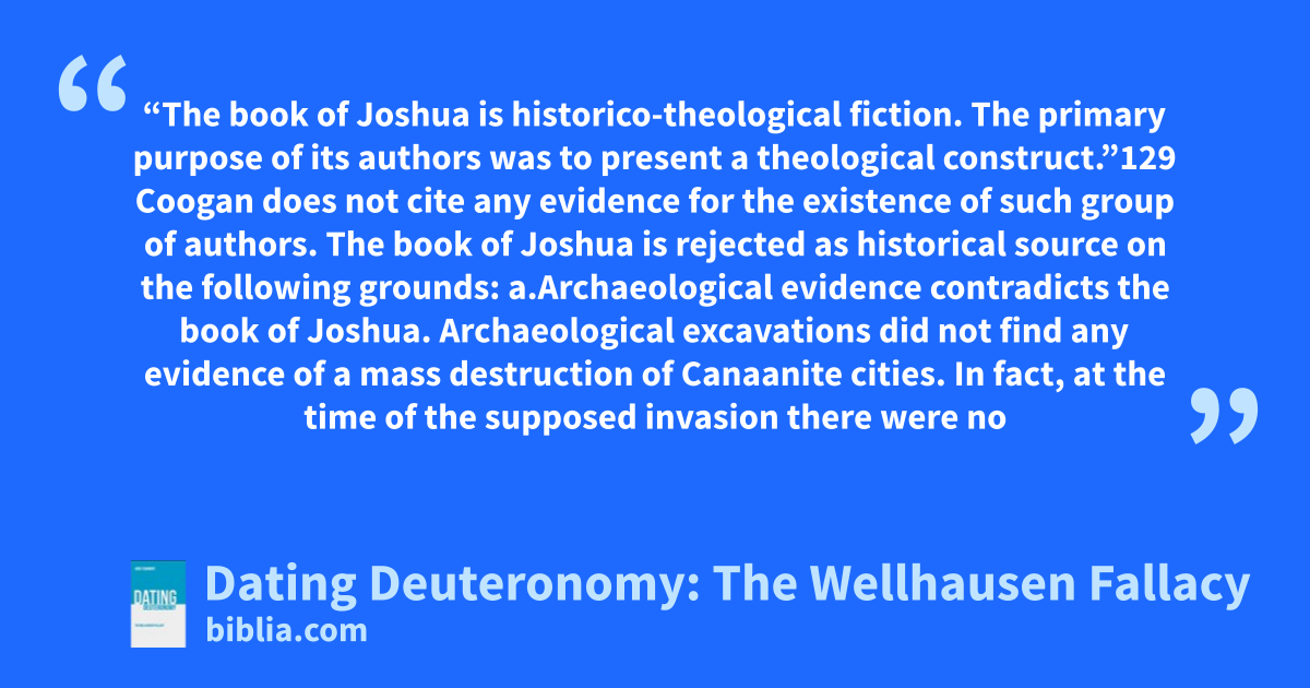 “The book of Joshua is historico-theological fiction. The primary purpose of its authors was to present a theological construct.”129 Coogan does not cite any evidence for the existence of such group of authors. The book of Joshua is rejected as historical source on the following grounds: a.Archaeological evidence contradicts the book of Joshua. Archaeological excavations did not find any evidence of a mass destruction of Canaanite cities. In fact, at the time of the supposed invasion there were no